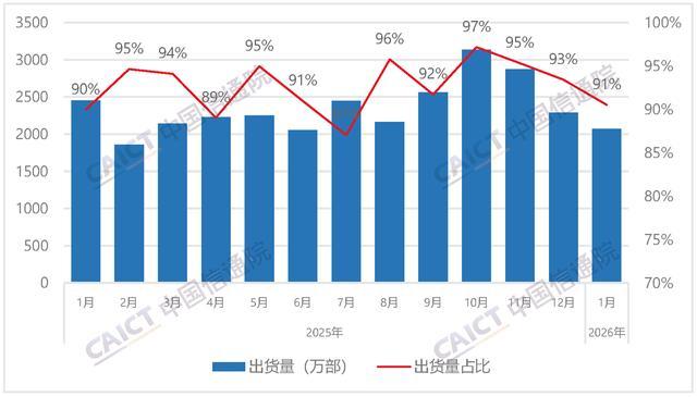 2026 年 1 月,智能手机出货量 2069.6 万部,同比下降 15.6%,占同期手机出货量的 90.5%;智能手机上市新机型 32 款,同比增长 28.0%,占同期手机上市新机型数量的 86.5%。