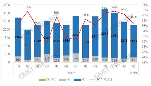 IT之家查询获悉,2025 年 1-12 月,国内市场手机出货量 3.07 亿部,同比下降 2.4%,其中,5G 手机 2.66 亿部,同比下降 1.9%,占同期手机出货量的 86.9%。