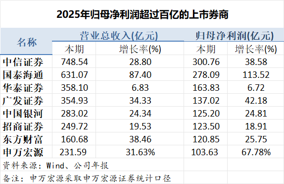 百亿净利队伍也有“新面孔”。2025年,申万宏源证券归母净利润达103.63亿元,2024年同期为61.76亿元,同比增长67.78%。东方财富也是百亿净利队伍里的新成员,去年归母净利润120.85亿元,同比增长25.75%。