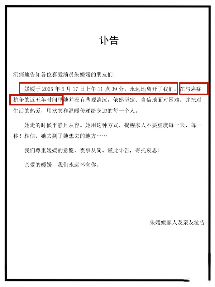 可谁承想,2025年5月21日,朱媛媛丈夫辛柏青突发讣告,向外界告知了朱媛媛去世的消息。