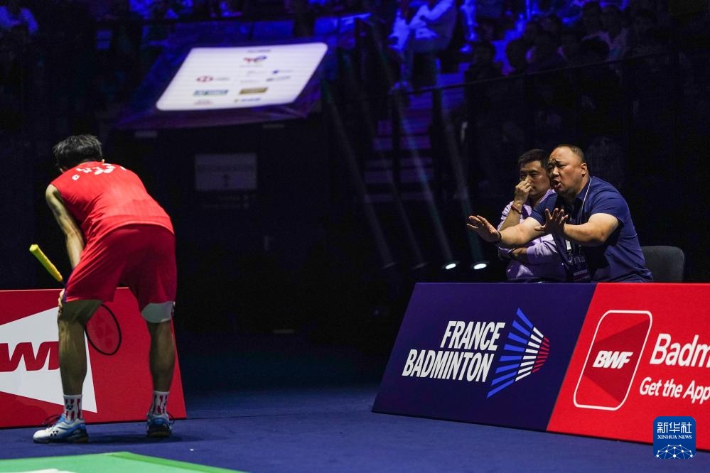 8月30日,中国羽毛球协会主席张军(右)在比赛中指导队员刘毅。新华社记者 彭子洋 摄
